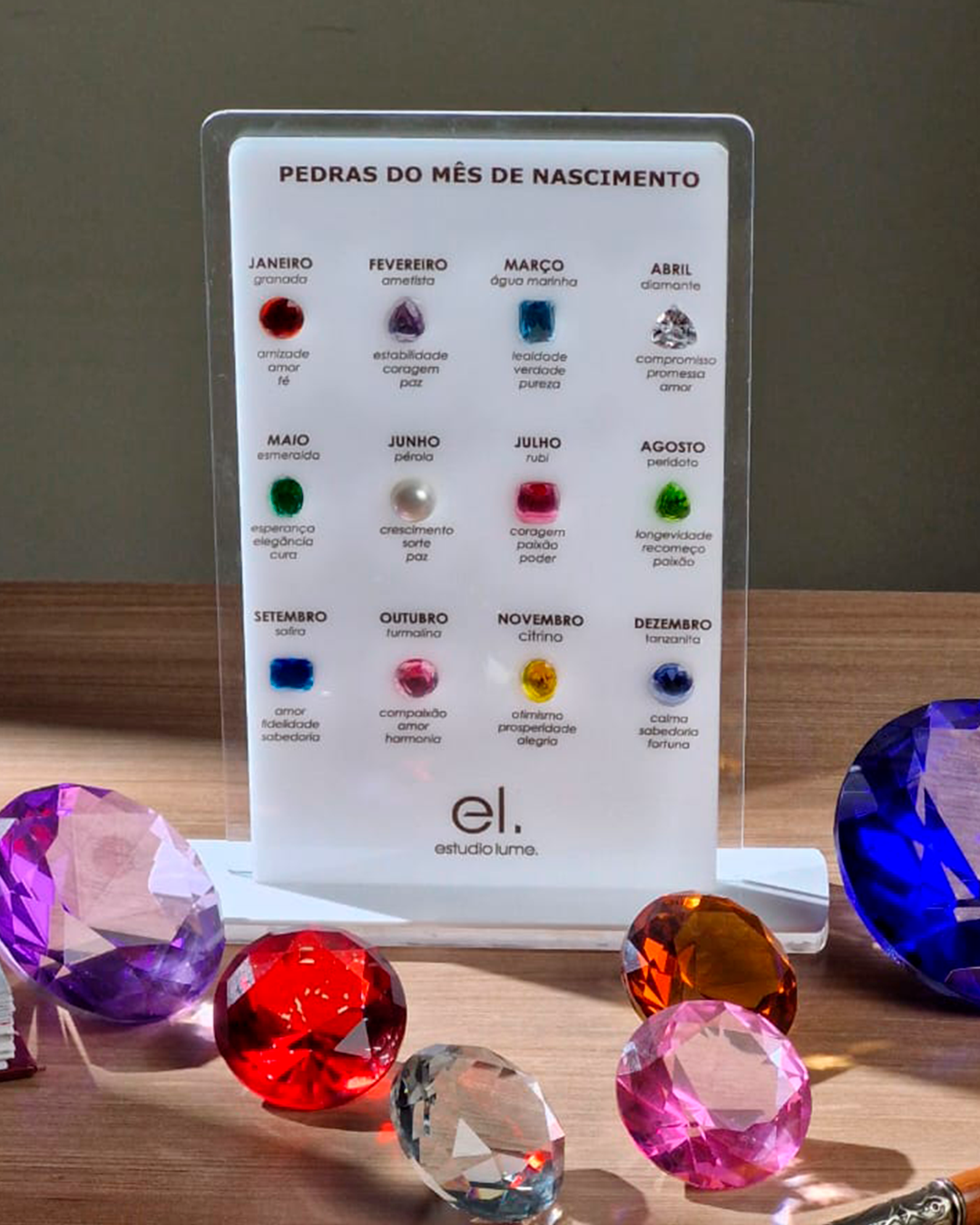 O Expositor Pedra do Mês de Nascimento do Estúdio Lume é a ferramenta ideal para valorizar o atendimento e criar uma conexão emocional entre o cliente e a joia. Com design compacto e sofisticado, ele apresenta as pedras de cada mês de forma organizada e atrativa, facilitando a escolha de gemas com significado.