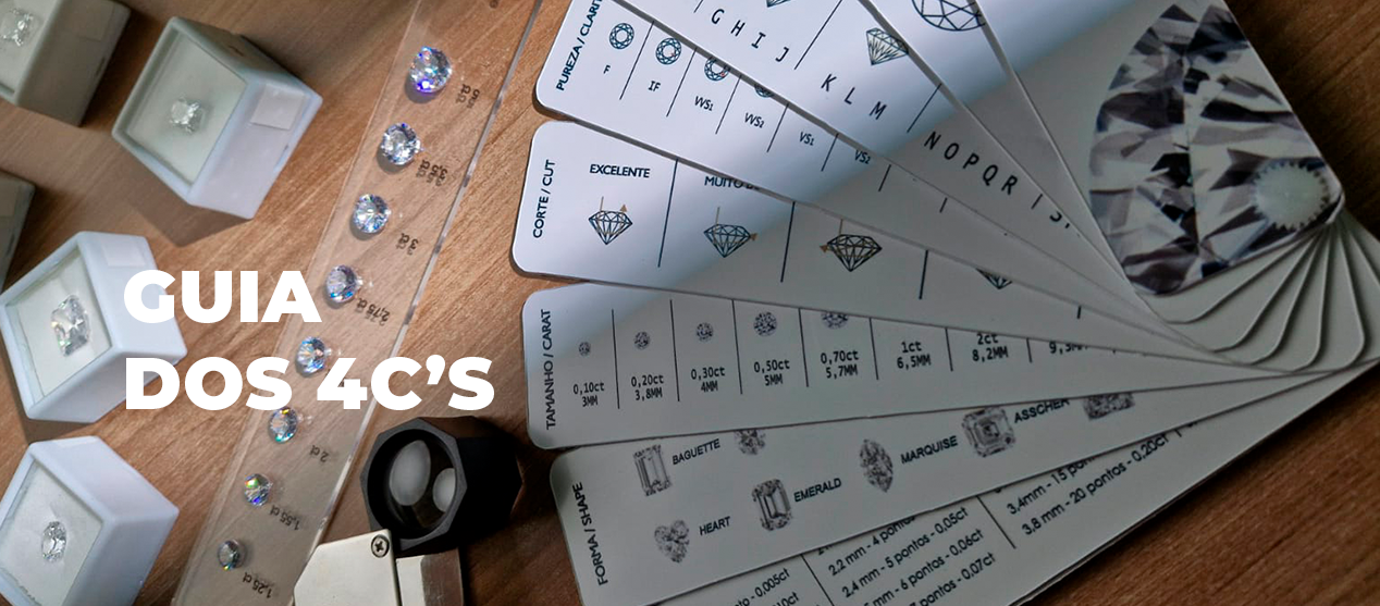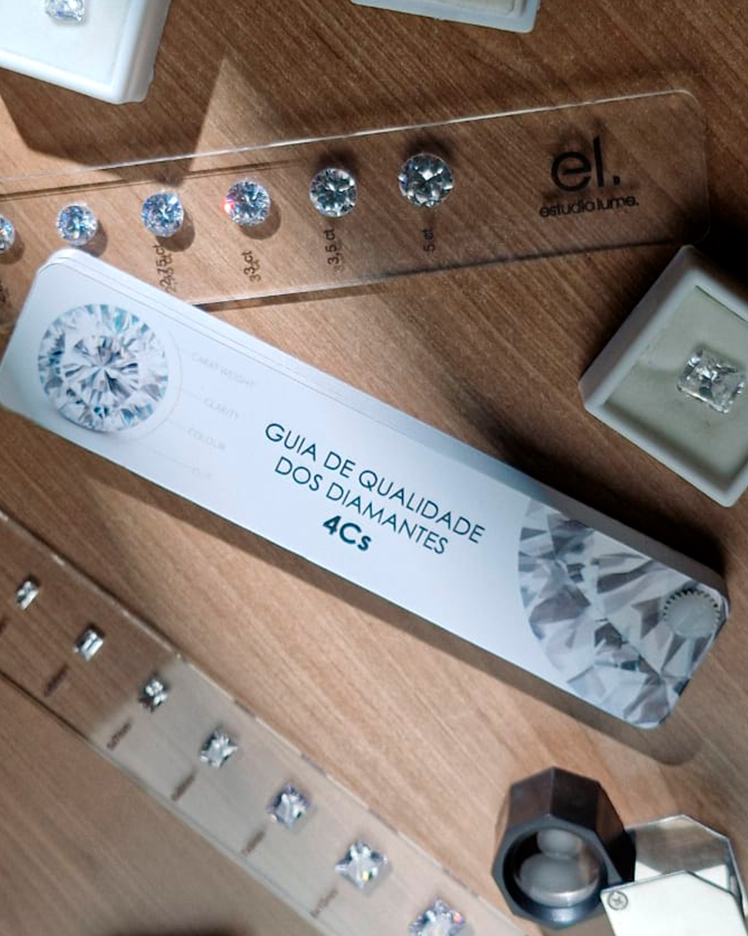 O Guia de 4Cs do Estúdio Lume é a ferramenta ideal para apresentar, de forma didática e visual, os critérios que definem a qualidade de um diamante: corte, cor, pureza e quilates.