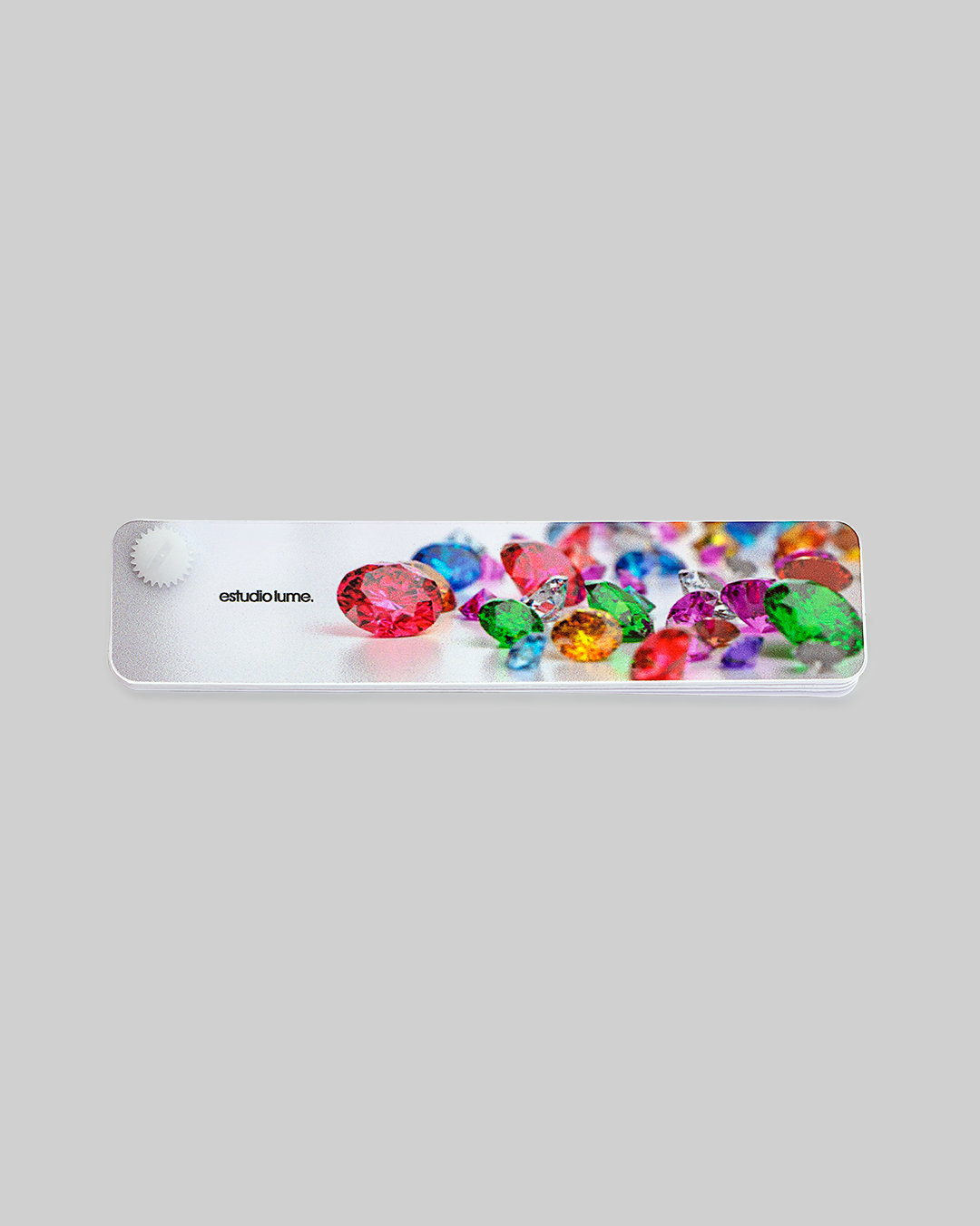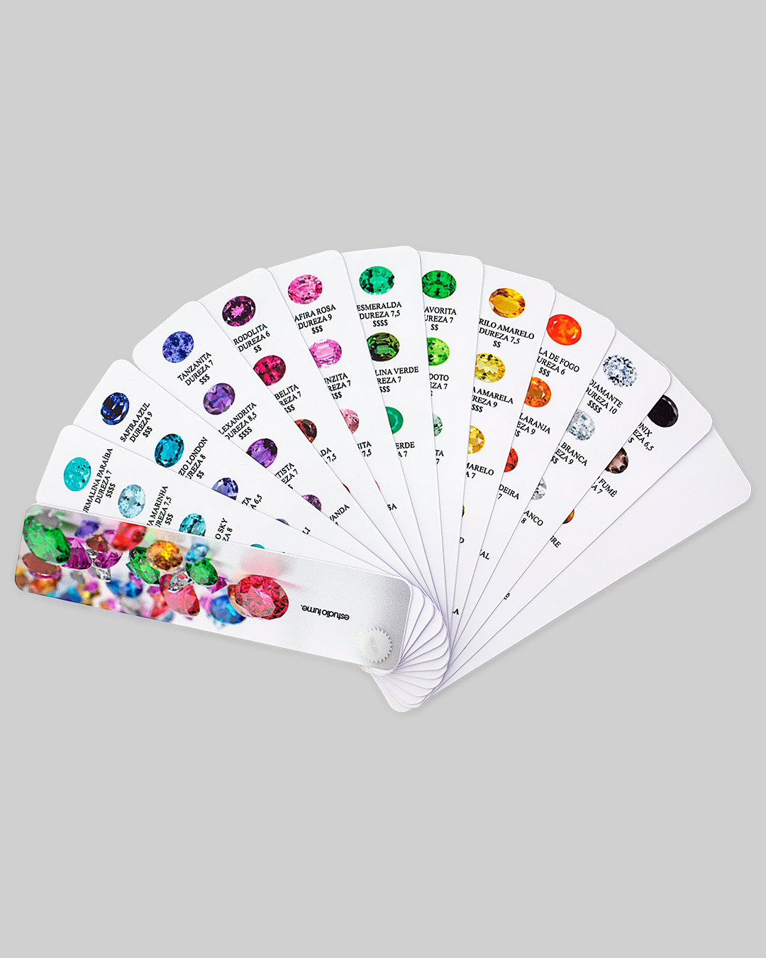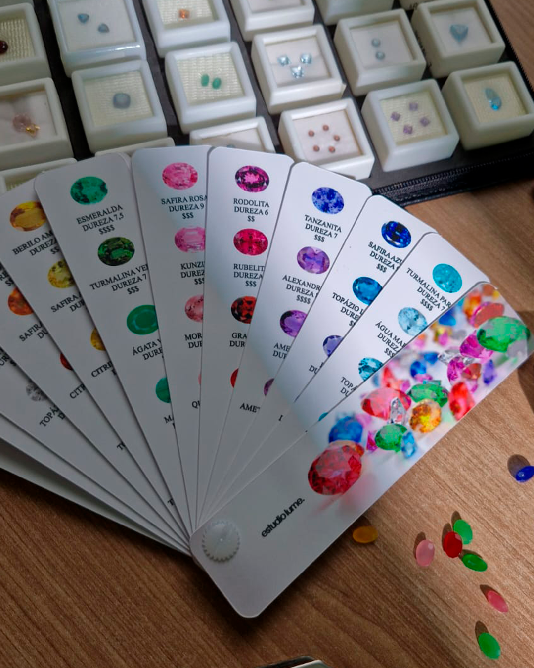 A Cartela de Gemas do Estúdio Lume é uma ferramenta prática e visual que reúne as principais gemas utilizadas na joalheria, apresentadas em amostras físicas organizadas por cor e categoria. Desenvolvida para facilitar o processo de escolha de pedras durante o atendimento ao cliente, ela também é ideal para designers que buscam referências cromáticas na hora de criar coleções.