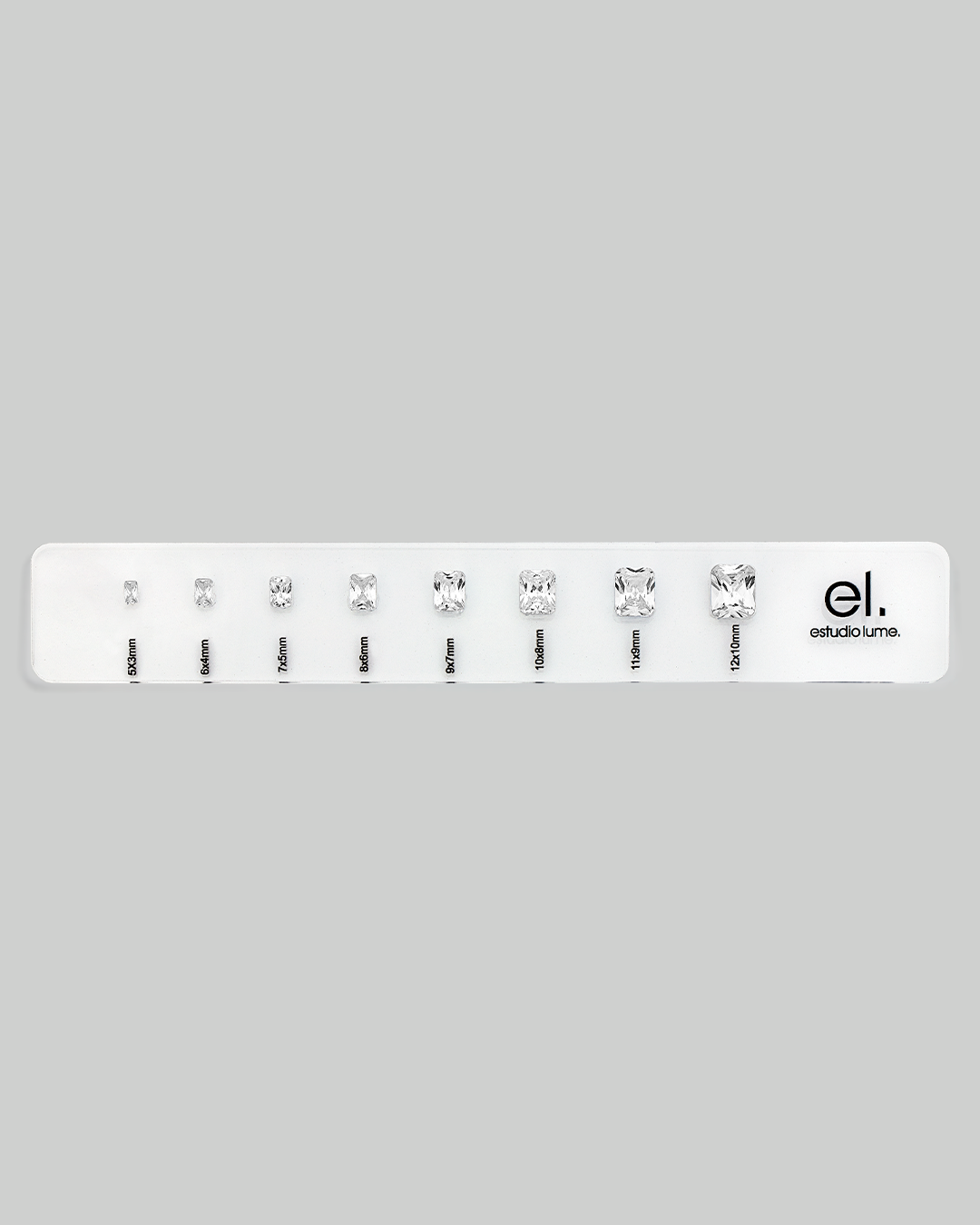 O Gabarito Baguete do Estúdio Lume é uma ferramenta técnica desenvolvida para o desenho preciso de gemas com lapidação baguete. Com medidas calibradas em milímetros, oferece proporções exatas para a criação de esboços limpos, simétricos e alinhados aos padrões da joalheria profissional.