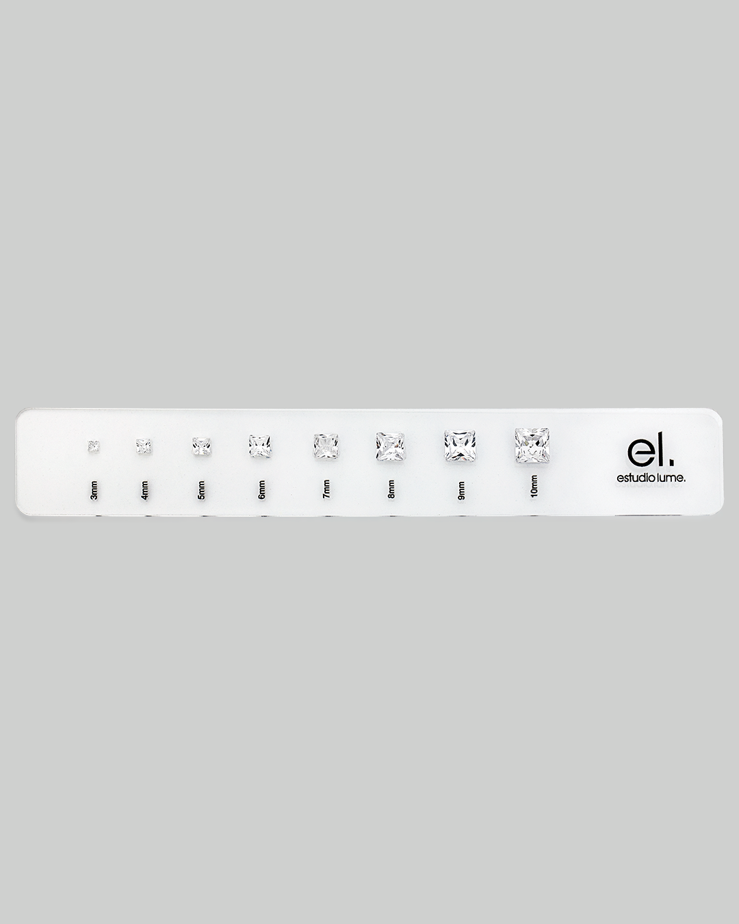 A lapidação carré é frequentemente utilizada em joias com estética geométrica e refinada — o gabarito facilita sua aplicação desde a fase inicial de criação até apresentações técnicas e atendimento ao cliente.