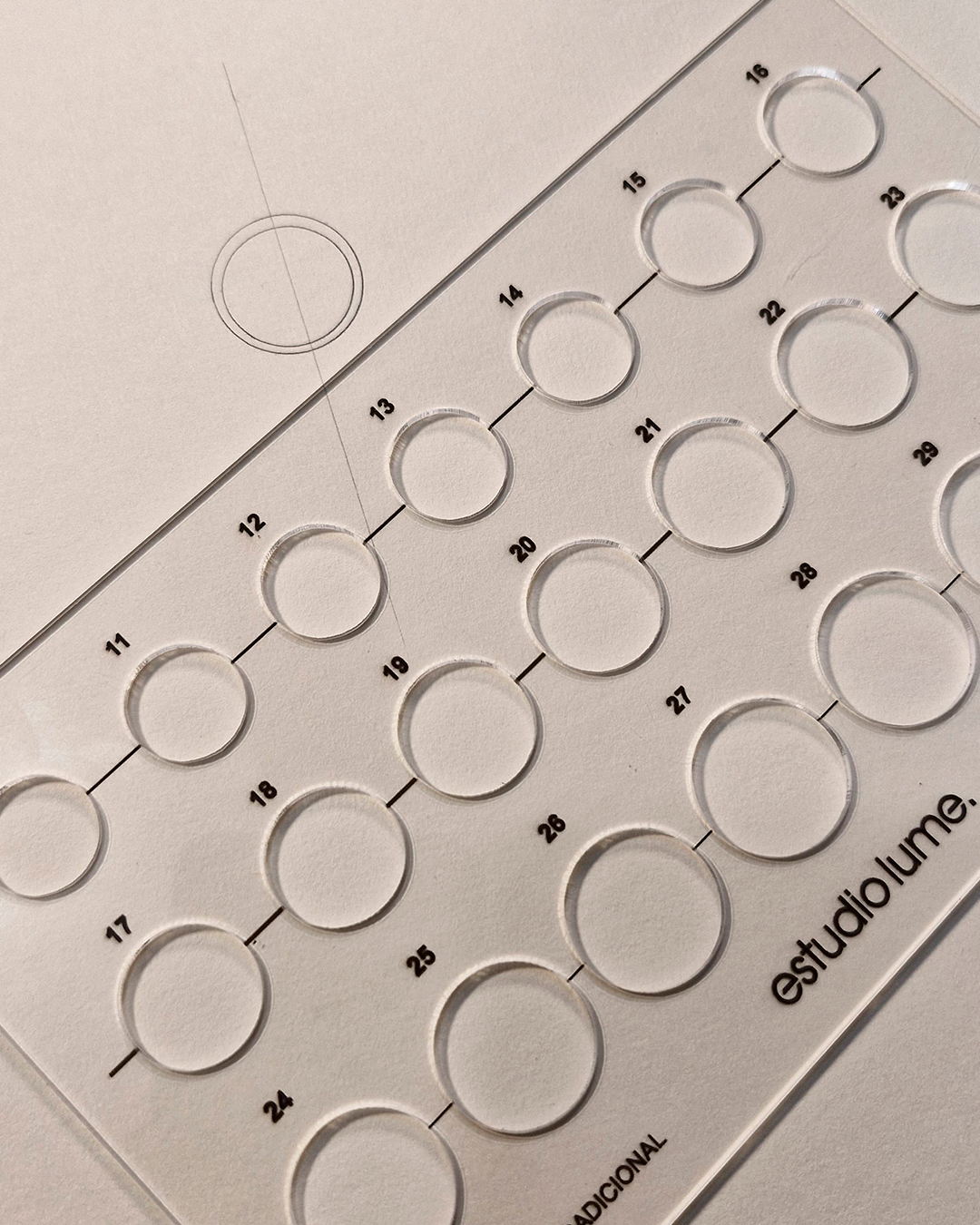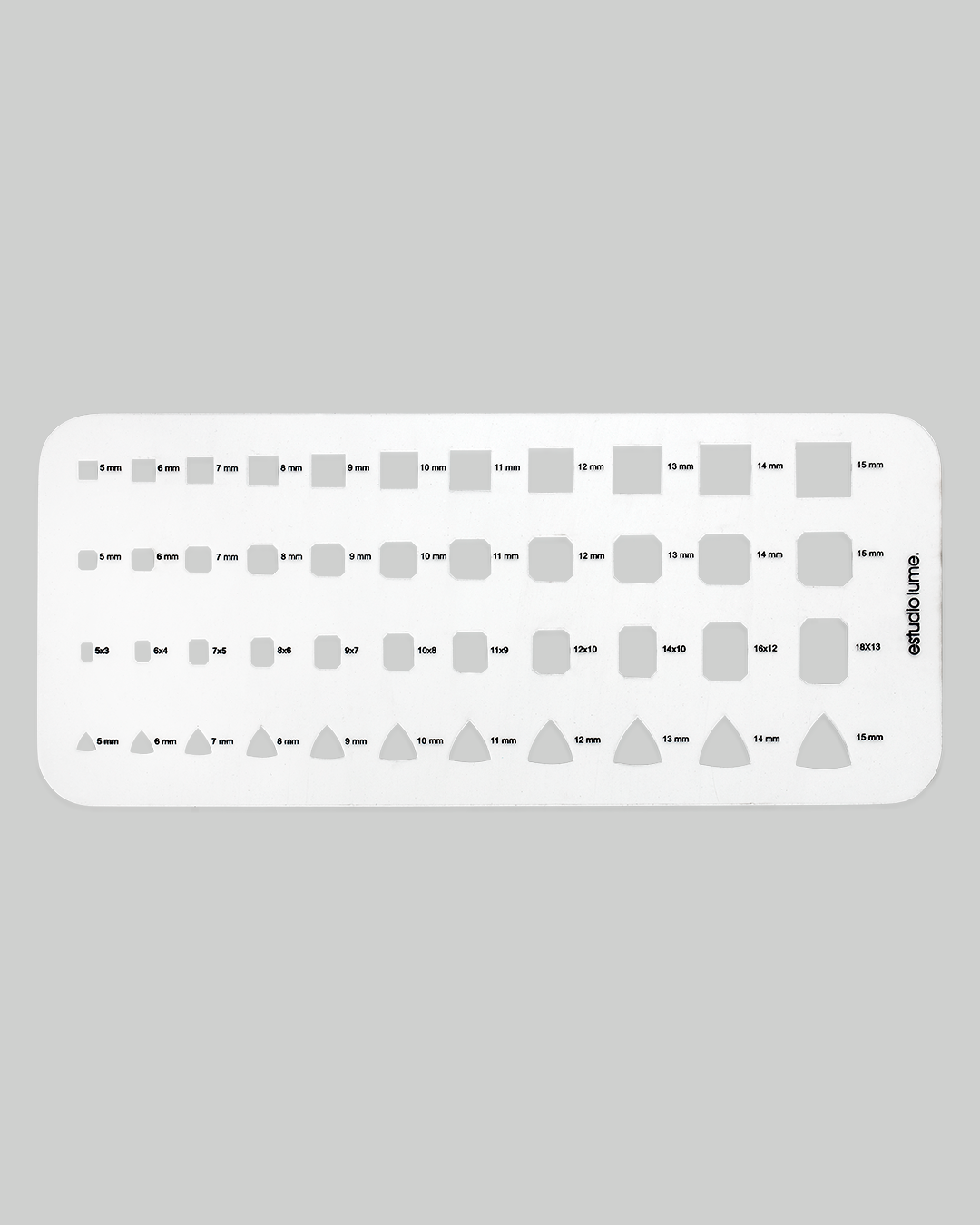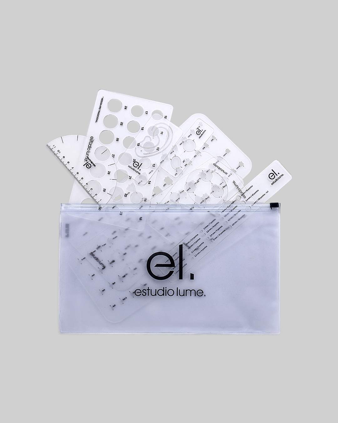 O Kit Gabarito com 8 Réguas do Estúdio Lume foi desenvolvido para reunir, em um único conjunto, as ferramentas essenciais para o desenho técnico de gemas e estruturas de joias. Ideal para profissionais que buscam praticidade, organização e eficiência no processo criativo, o kit contempla os principais formatos de lapidação e suporte para esboço técnico completo.